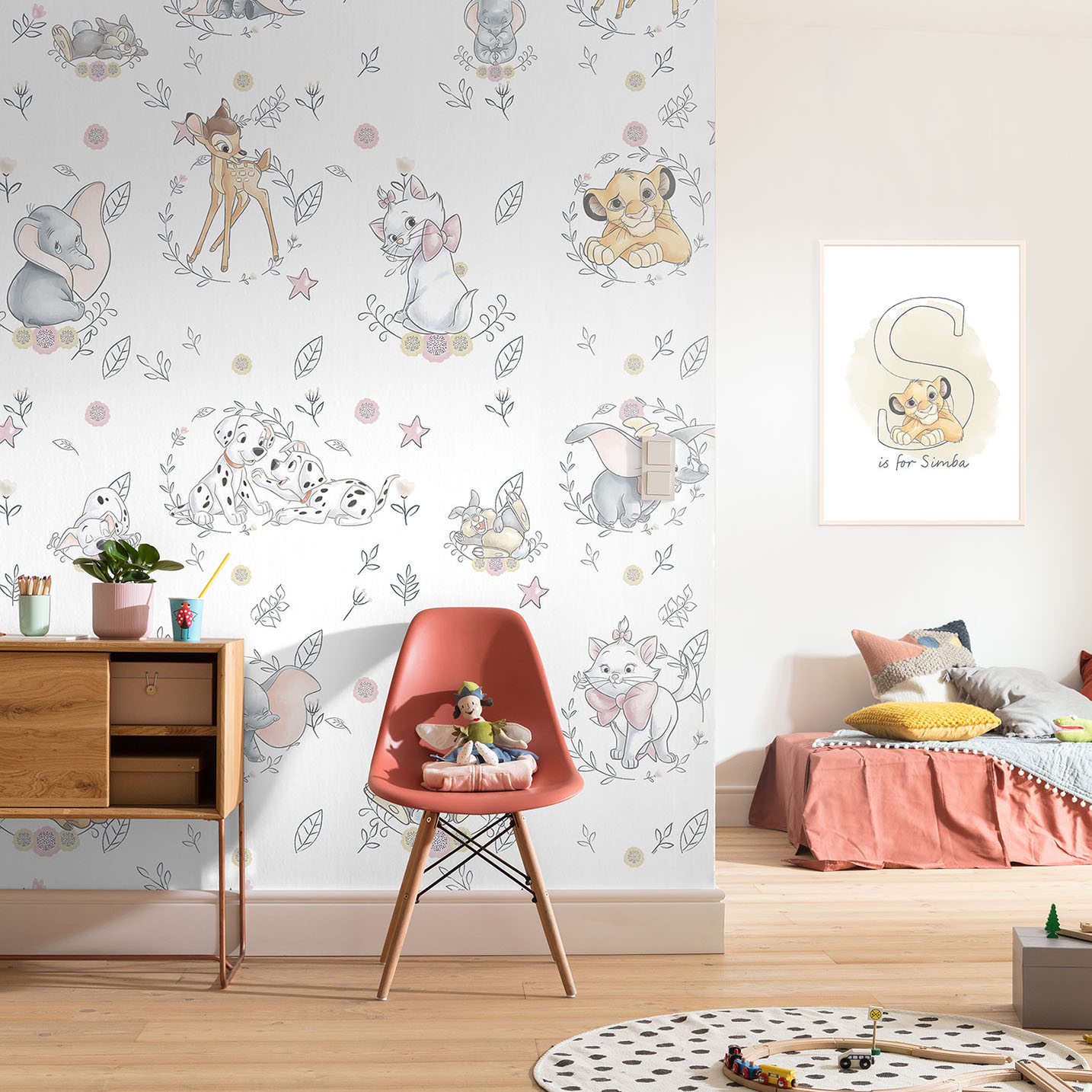 Ein Best-Of der süßesten Disney Stars. Bambi, Simba, Dumbo & Co. sorgen als Fototapete für eine kuschelige Raumatmosphäre im Babyzimmer.