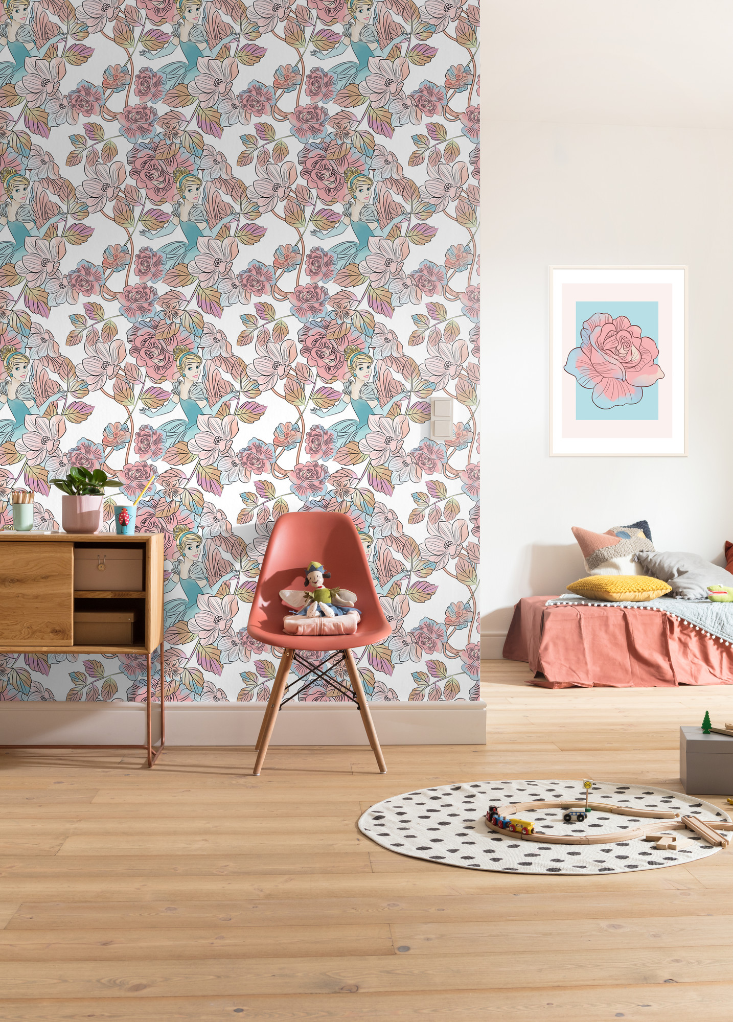 Cinderella im Blütenzauber. Die hübsche Prinzessin zwischen romantischen Blütenranken zaubert einen Hauch von Disney-Magie in jedes Mädchenzimmer.