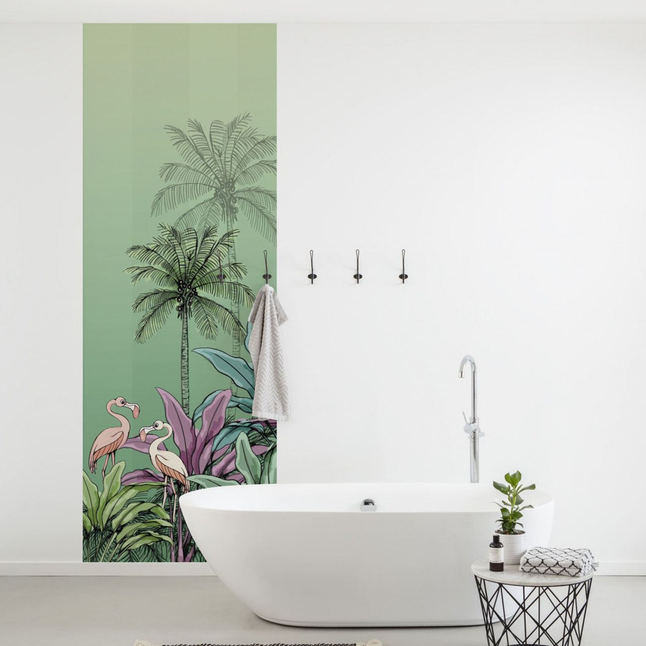 Es muss nicht immer Simba oder Nala sein, manchmal ist ein König der Löwen Flamingo der beste Partner für dein Schlafzimmer. Eine tropische Collage für die Wand: Rosafarbene Flamingos tummeln sich unter paradiesischen Palmen.