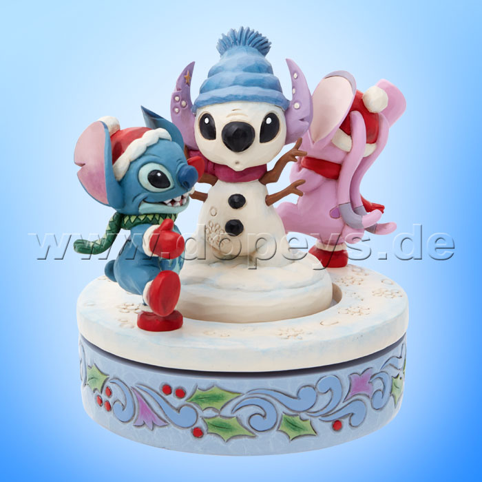 Diese drehbare Weihnachtsfigur von Jim Shore zeigt Disney's beliebtesten Außerirdischen Stitch und seine Angebetete Engel. Die beiden haben einen genialen Schneemann gebaut und flitzen nun im Kreis um ihn herum, mit Handschuhen, Weihnachtsmützen, Schals und einem Lächeln.