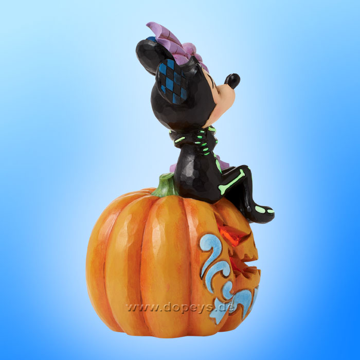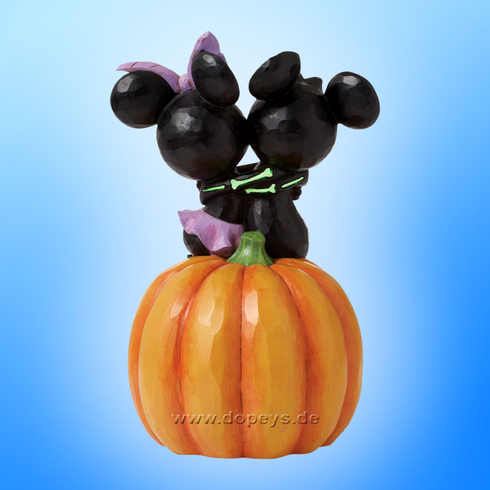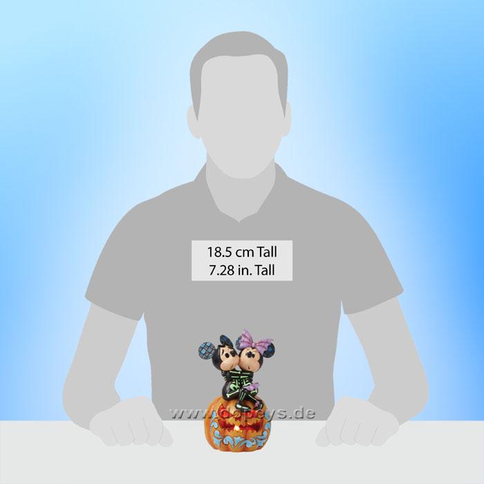 In dieser schaurigen Szene von Jim Shore haben Mickey and Minnie Maus Skelett Kostüme angezogen und sitzen eng umschlungen auf einer mit Mustern verzierten Kürbislaterne. Ihr schockierter Gesichtsausdruck zeigt perfekt, wie erschreckend Halloween sein kann und bringt eine faszinierende und unheimliche Ausstrahlung in diese mit einem LED Licht beleuchtete Figur.
