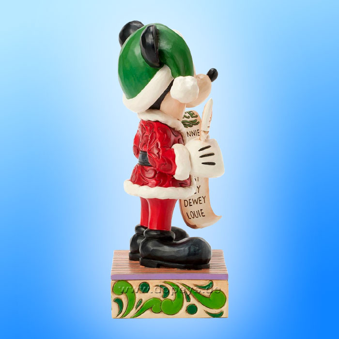 In dieser bezaubernden Weihnachtsfigur von Jim Shore trägt Mickey Mouse einen markanten roten Anzug mit verschnörkelten Mustern, komplettiert durch einen mit Schmucksteinen versetzten grünen Gürtel und eine Weihnachtsmütze mit Winterbeeren. Lächelnd hält er eine Feder und eine Liste mit braven und ungezogenen Disney-Charakteren in der Hand.