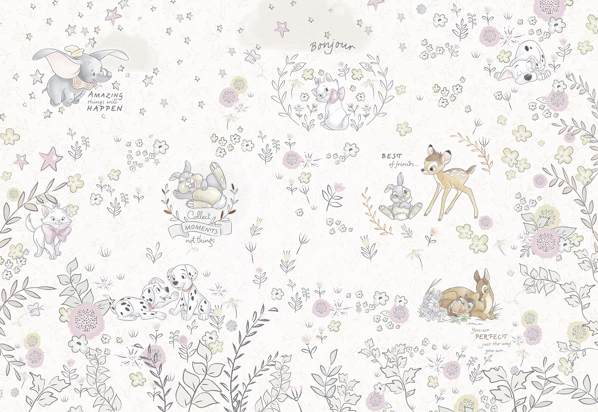 Die beliebten Disney-Charaktere fürs Babyzimmer: Bambi, Klopfer, Dumbo, die flauschige Katze Marie und die süßen Welpen der 101 Dalmatiner auf einer Fototapete für die Kinderzimmerwand.
