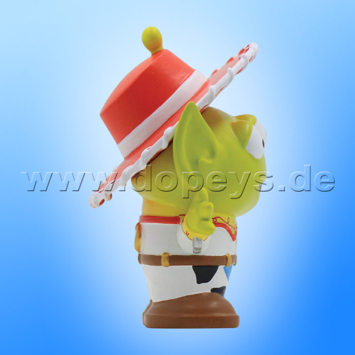The Pizza Planet aliens seem to be attending a Pixar party this evening. Masquerading as their favourite characters, the aliens don an array of Disney disguises. This one dresses as Toy Story's Jessie, with a red cowgirl hat and uniform.