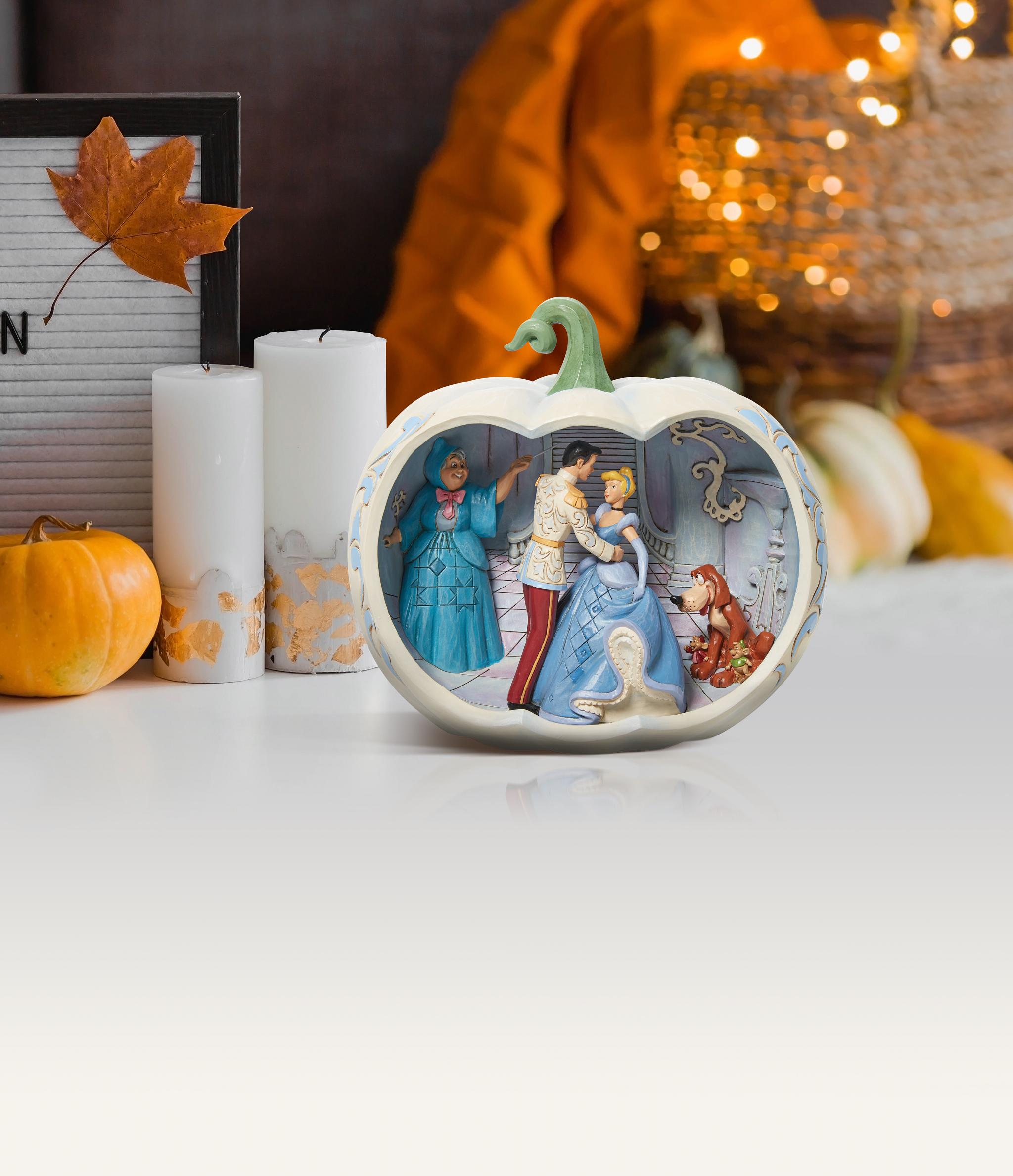Cinderella gets the night of her life falling in love at the ball, but when the clock strikes midnight, her Fairy Godmother's magic runs out. Framed within an enchanted pumpkin, this Jim Shore masterpiece captures Cinderella's favorite moment.
