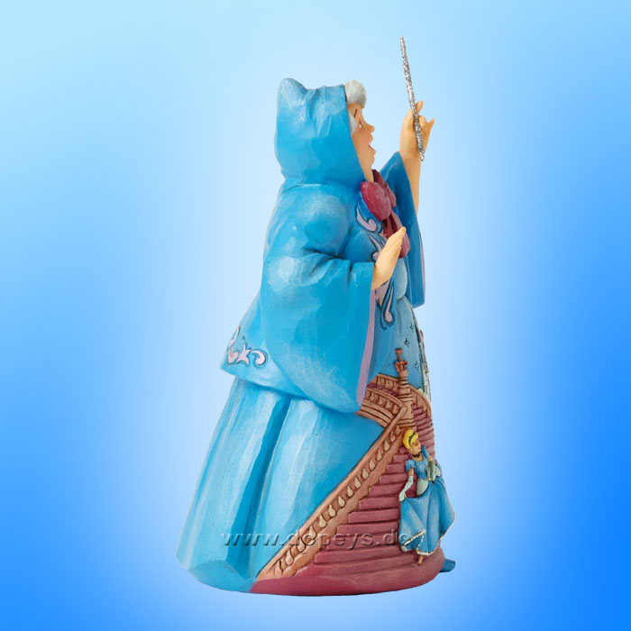 In this magical Jim Shore design, the Fairy Godmother smiles with her wand, her rosemaling blue robes parting to reveal Cinderella racing down the steps as the clock strikes midnight. This captivating moment is when she will lose her glass slipper.