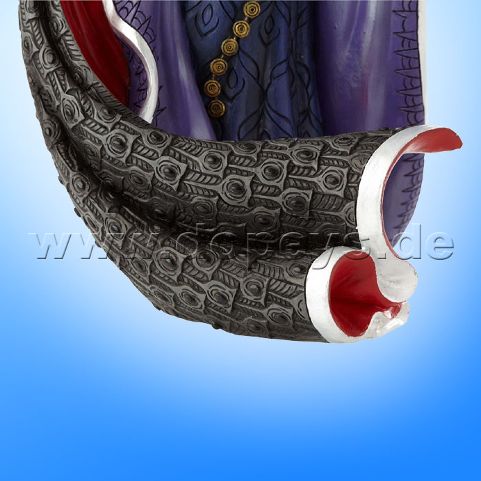 Snow White's menacing villain commands respect and attention in this elegant gown. The Evil Queen's floor-length cape creates a dramatic backdrop, updated with a tonal deco pattern and red lining. Faux gems and a newly ornate belt give the final luxe touches. The figurine is made from resin.